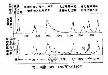 毛主席和黃炎培曾討論過“中國歷史週期律”,這段史話激發了我的思考。我打開歷史年代表,發現朝代有長有短,有強有弱,似乎並沒有一定的規律,曾經百思不得其解。後來我讀了李四光的《中國週期性的內部衝突戰》(載《中國科學與藝術雜誌》,1931年,見《史學名篇》一書),他統計了歷代史書上記載的戰亂數量,作了一個週期圖(如下),啓發我總結出了中國歷史的長週期規律,每一週期大約700到800年。