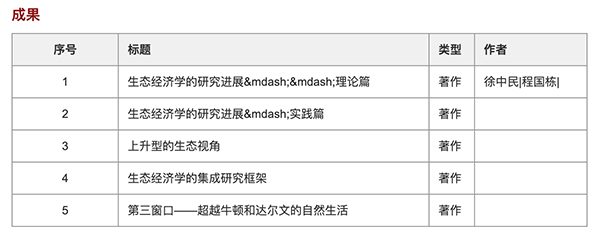 該項目成果包括五方面:生態經濟學的研究進展,理論篇;生態經濟學的研究進展,實踐篇;上升型的生態視角;生態經濟學的集成研究框架;第三窗口——超越牛頓和達爾文的自然生活。其中,《理論與實踐(I)》、《理論與實踐(II)》這兩篇論文屬於“生態經濟學的集成研究框架”成果。