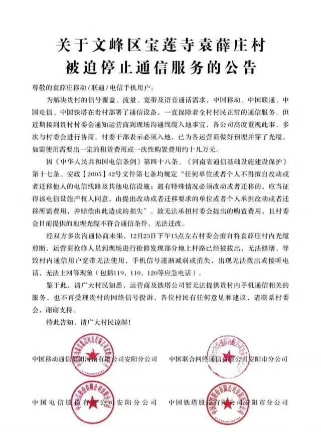 據公告內容顯示,為解決位於河南省安陽市文峯區寶蓮寺袁薛村的信號覆蓋、流量、寬帶及語音通話需求,中國移動、中國聯通、中國電信以及中國鐵塔公司為其部署了通信設備,一直保障該村正常的通信服務。