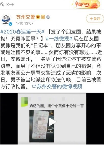 此前,1月10日下午,江蘇省蘇州市交警支隊官方微博@蘇州交警 發佈消息稱,“現在朋友圈就像我們的‘日記本’,朋友圈分享開心的事或是吐槽不爽的事,然而你有沒有想過,近日,安徽亳州,一名男子因違法停車被交警貼罰單,而男子不但沒有認識到自己的錯誤,竟發朋友圈公開辱罵交警造成惡劣影響,次日,男子被當地派出所依法傳喚,目前已被警方行政拘留。”