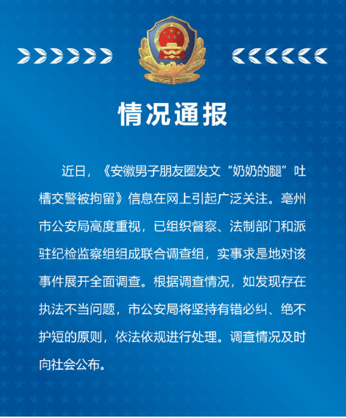 @亳州公安在線 稱,根據調查情況,如發現存在執法不當問題,亳州市公安局將堅持有錯必糾、絕不護短的原則,依法依規進行處理。調查情況及時向社會公佈。