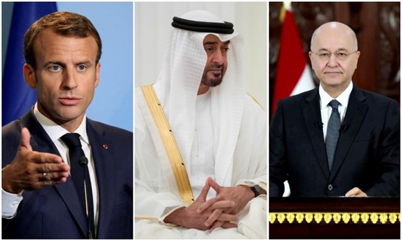 1月5日,法國總統馬克龍就伊朗局勢同阿布扎比王子薩義德和伊拉克總統薩利赫通電話(@法新社)