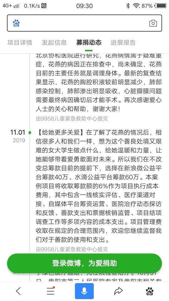 10月29日,9958西南執行團隊在“進展報告”中公佈,“考慮到花燕後期的治療費再加上弟弟的病等多方因素,故此在原有100萬額度的基礎上為其開通二期籌款,現已將某平台的80萬額度調整至60萬。”