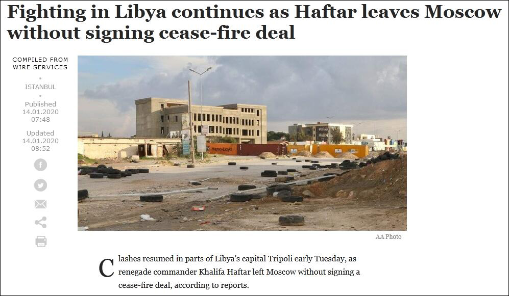 與土耳其執政黨關係密切的《每日晨報》(Daily Sabah)報道,隨着和談無果而終,在哈夫塔爾離開莫斯科以後,當地時間利比亞清晨,“國民軍”向的黎波里發動了新的攻勢,的黎波里南部傳出炮聲。