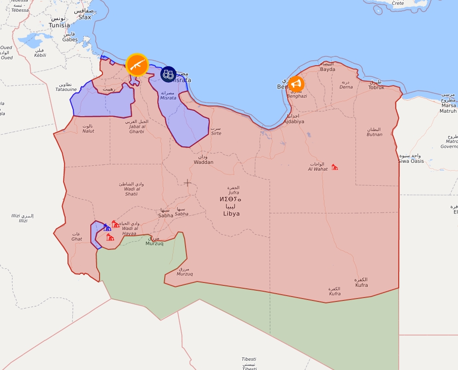 1月14日的利比亞局勢,紅、藍色分別為“國民軍及民族團結政府的控制範圍 圖自:liveuamap