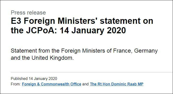 (觀察者網訊)據路透社當地時間1月14日報道,當天,法國、英國和德國正式啓動了伊核協議中的爭端解決機制,這是迄今為止三國為該協議所採取的行動中最強有力的一步。