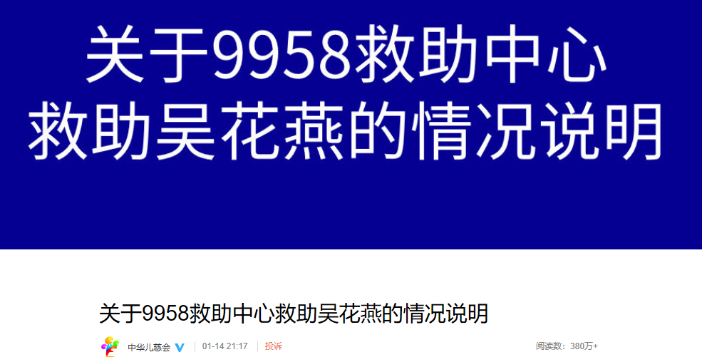 2019年11月4日,9958救助中心轉款2萬元(微公益平台1萬元,水滴公益平台1萬元)至醫院,用於吳花燕的治療。而後,結合當地政府啓動救助機制的現實情況,吳花燕及家屬同時提出捐款使用意向需求:餘下款項希望預留至手術和康復治療再使用(經核實,吳花燕病情有反覆,尚未達到手術條件),因此餘下善款未能撥付至醫院。2020年1月13日,9958救助中心得到吳花燕突然因病去世的消息。