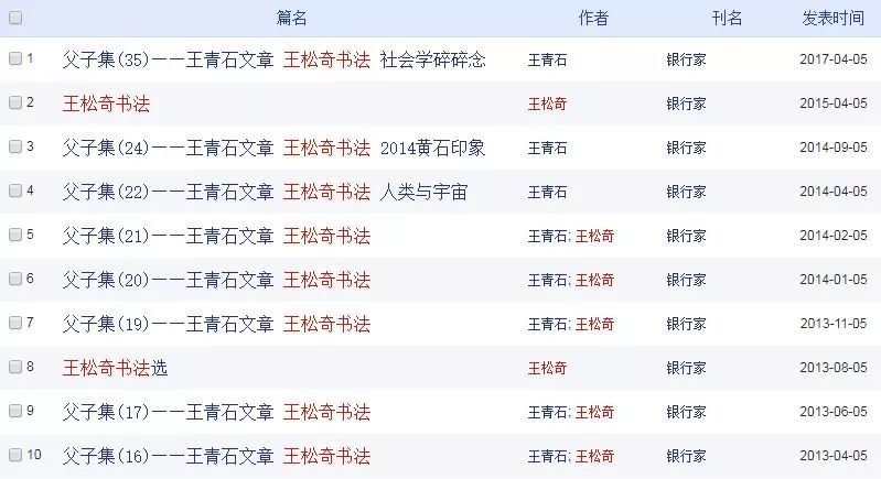 在知網檢索發現,王松奇、王青石父子已在《銀行家》發表數十篇書法、散文作品。