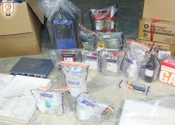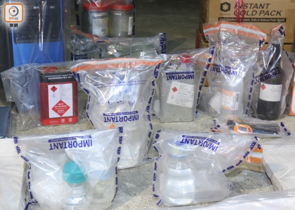 此外還檢獲了一批化學物品,包括高濃度硫酸、雙氧水、汽油、約重1公斤化學粉末,防毒面具、眼罩、手提電腦及大量玻璃器皿。