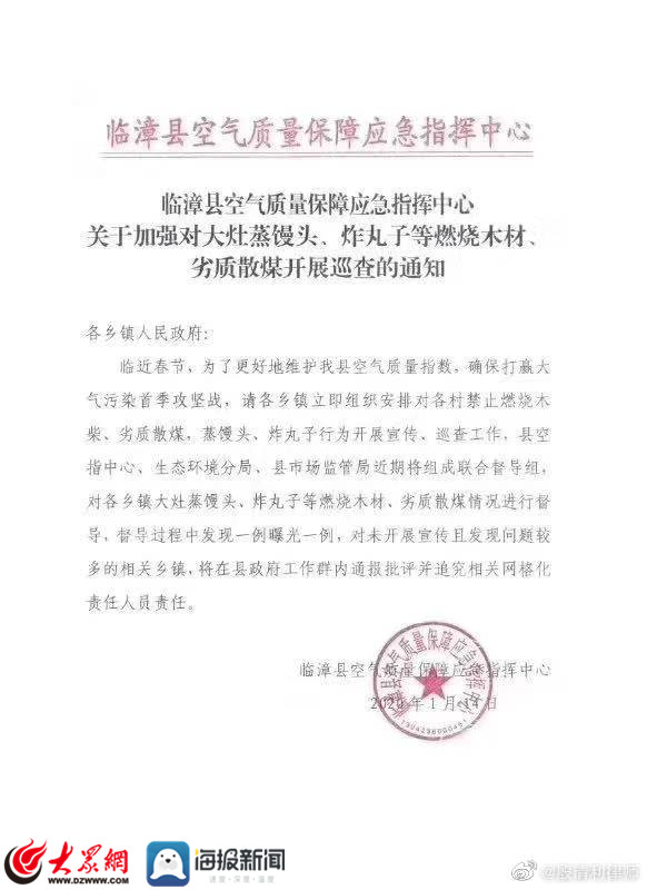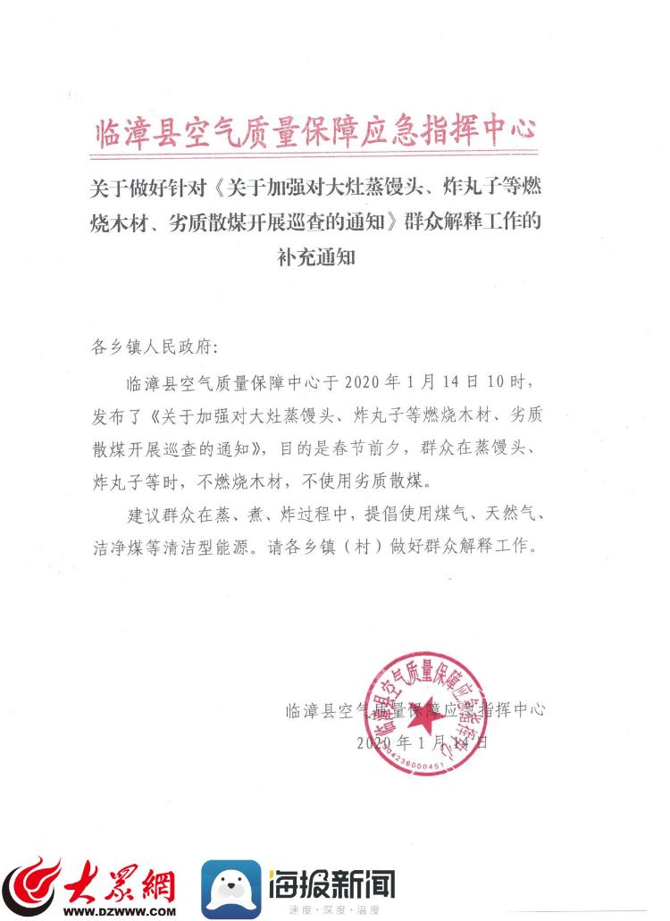 1月14日,臨漳縣空氣質量保障應急指揮中心負責人郭先生回應大眾網·海報新聞記者的採訪時説,並非禁止大灶蒸饅頭、炸丸子,通知主題是禁燃木材、劣質散煤,羣眾過春節蒸、煮、炸使用天然氣、煤氣、潔淨煤都是允許的。