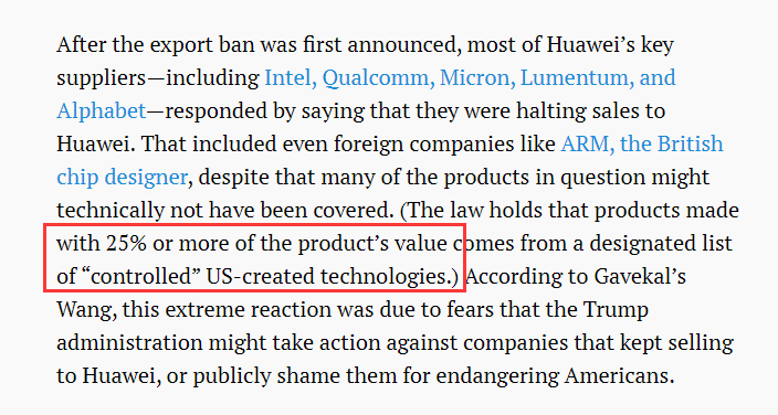 該《出口管理條例》規定,美國本土以外的企業,若向清單目標提供的產品中,含一定比例美國技術、零部件,同樣也會被美方制裁。這個比例被稱之為“美國最低含量標準”。華為事件中,美方將次標準定為25%。
