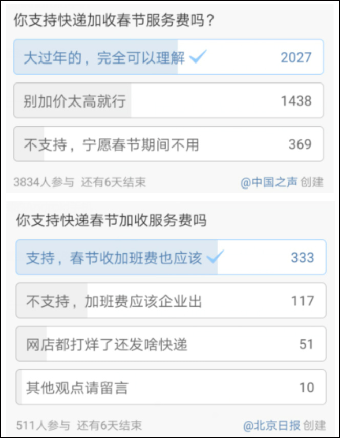 韻達表示,1月24日至30日春節期間將適當加收服務費;圓通則稱部分地區快遞費用將有一定的調整。對於快遞漲價,北京日報等多個媒體在微博上發起投票,多數網友對此表示支持。