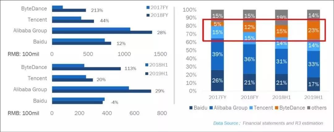 基於發展迅速的產品矩陣,巨大的流量使得廣告成為字節跳動主要的商業化路徑之一。2019年上半年,字節跳動以23%的市場份額(相當於人民幣500億元),成為僅次於阿里巴巴的中國第二大數字廣告商,與去年同期相比,廣告收入增長了113%,其中大部分增長來自抖音和今日頭條。