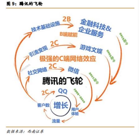 騰訊的商業模式是基於微信和QQ巨大的流量來源,一方面通過遊戲、廣告、大文娛進行C端的流量變現,另一方面通過金融科技和雲計算進行B端賦能。不過字節系的短視頻等內容流量,打破了騰訊的流量壟斷優勢,而且騰訊在雲計算、金融科技等企業服務領域根基薄弱,導致騰訊的“飛輪”轉動緩慢下來。