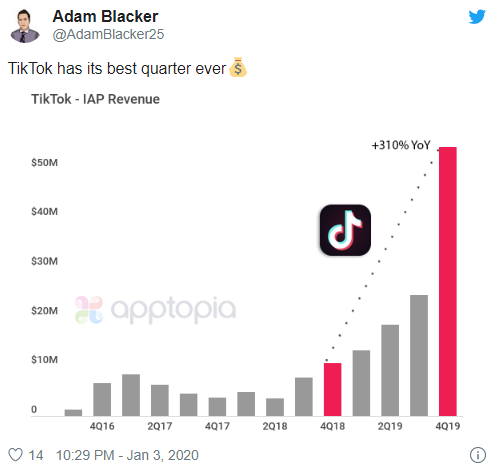 字節全球化加速,TikTok作為衝鋒槍,在2019全年的下載總量超過5.08 億,同比增長 55% , MAU 在海外達到 5 億,領先於Twitter 、Snapchat等。apptopia數據顯示,TikTok的內購收入同比增長 310%。海外業務成功,是字節跳動這一年最顯著的成果。