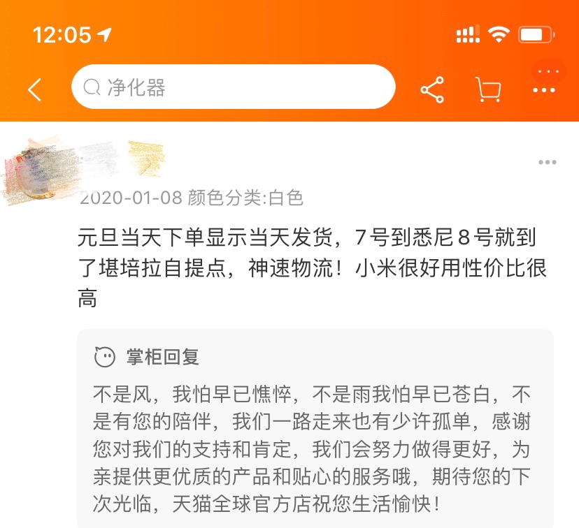 “元旦下單,8號就到了,真的太及時了。”居住在堪培拉的消費者收到了他在天貓全球官方店購買的空氣淨化器後如此評價。