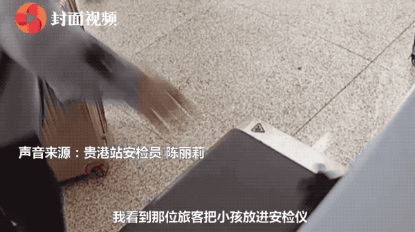 結果,這位爸爸一着急竟將坐在拉桿箱上的兒子,當成行李放到安檢傳送帶上。