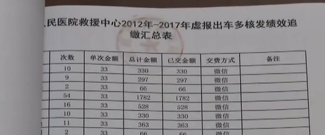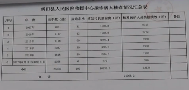 調查人員介紹,由於醫院管理系統升級,2012年6月30日之前的急救車出車登記,已無處可查。最終查實,2012年7月至2018年4月期間,新田縣人民醫院急救中心工作人員,共虛造救護車出車記錄215次,多核發醫護人員績效獎和司機出車補助費25000多元,涉及醫務人員65人。