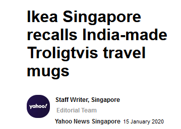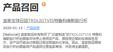 (觀察者網訊)1月15日,宜家中國公司網站刊發召回通知,其出售的印度製造“特魯利維斯旅行杯”(TROLIGTVIS)檢出超標致癌物質,因此在全球召回該產品。