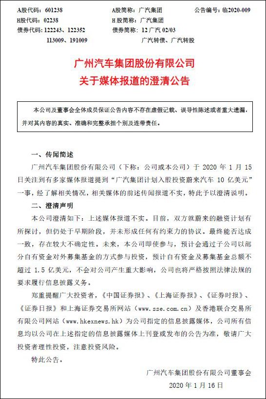 廣汽集團聲明稱,公司關注到有多家媒體報道提到“廣汽集團計劃入股投資蔚來汽車10億美元”一事,經瞭解相關情況,相關媒體的前述傳聞報道不實,特此予以澄清説明。目前,雙方就蔚來的融資計劃有所探討,但仍處於早期階段,並未形成任何有約束力的協議。最終能否達成一致,存在較大不確定性。未來,本公司即使參與,預計會通過子公司以部分自有資金對外募集基金的方式參與投資,預計自有資金及募集基金總額不超過1.5億美元,不會對公司產生重大影響,公司也將嚴格按照法律法規的要求履行信息披露義務。