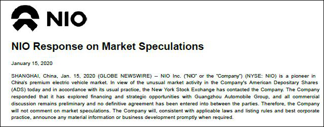 對此,蔚來也在官方網站發表公告稱,由於蔚來在美髮售的美國存托股票交易異常活躍,紐約證券交易所循例聯絡了公司。蔚來回應紐交所問詢,解釋公司一直在與廣汽集團探索融資和戰略機會,而目前所有的商務討論仍處在早期階段,雙方暫未達成任何最終協議。因此,公司對市場的揣測不做評論。蔚來遵守相關法律、上市規則和最佳企業治理實踐,對於重大信息或商業發展將及時披露。