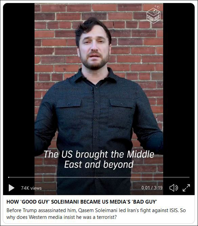 今日俄羅斯(RT)15日報道,獨立記者丹·科恩(Dan Cohen)在臉書賬號“In The Now”上發佈的題為“好人蘇萊曼尼如何成為美國媒體口中的‘惡人’”的視頻於星期二被臉書刪除。
