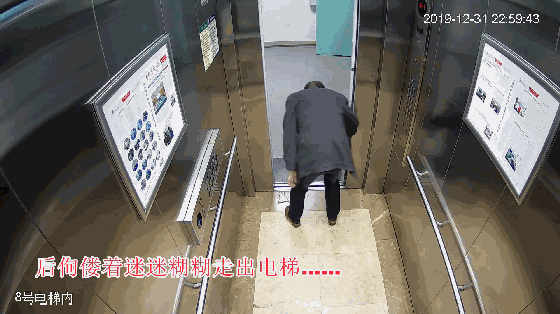 因體力不支他彎着腰雙手扶住電梯扶手休息了一會,接着佝僂着腰走出電梯間。