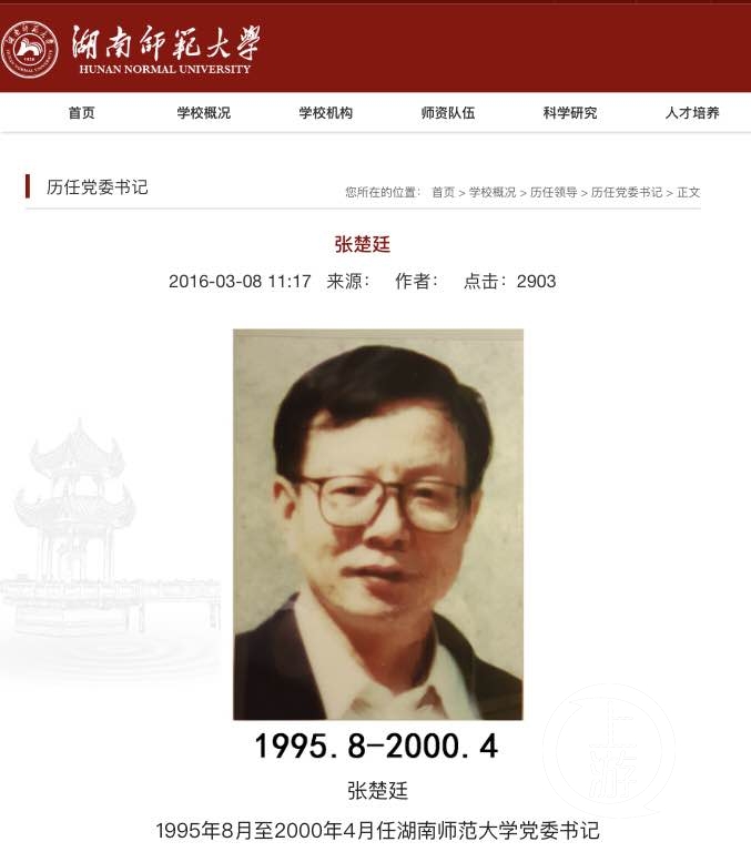 官方信息顯示,張楚廷自1986年4月至2000年4月,擔任湖南師範大學校長;1995年8月至2000年4月,還擔任湖南師範大學黨委書記。