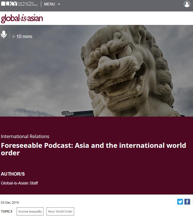 新加坡國立大學李光耀公共政策學院數字平台global-is-asian網站2019年12月3日以《展望未來的一期節目:亞洲與世界秩序》為題刊登了對院長柯成興的採訪實錄