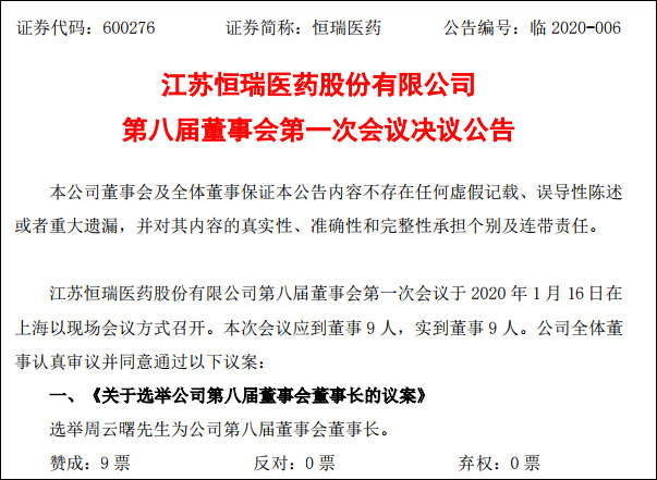 而接任的周雲曙並非空降。公告顯示,周雲曙為高級工程師、博士,1995年畢業於中國藥科大學,1995年至今在江蘇恆瑞醫藥股份有限公司工作,歷任發展部副部長、副總經理、總經理、董事。
