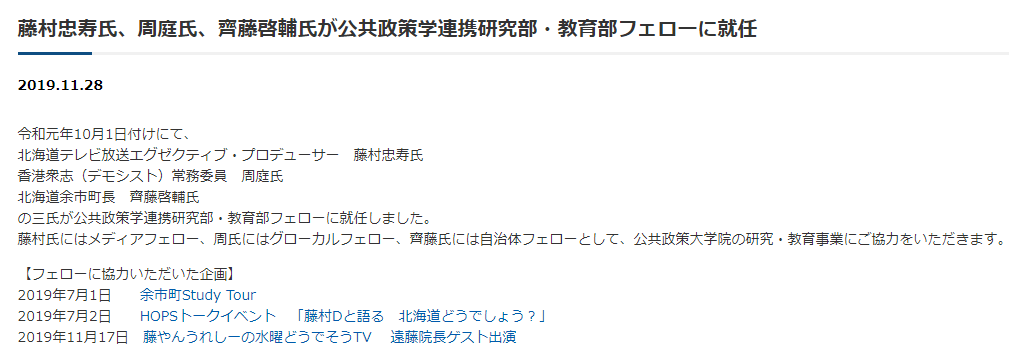 據《北海道新聞》17日報道,2019年11月,北海道大學公共政策大學院2019年11月任命周庭為特別研究員,任期至今年3月,該職位沒有薪水,周庭本人也至今沒有赴任。