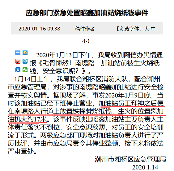 潮州市應急管理局宣教科科長張映浩説,“1月9號的晚上,差不多12點鐘,他(加油站)已經停業了,停業以後就拜神,按當地習俗去拜神,拜完就去燒紙錢。”