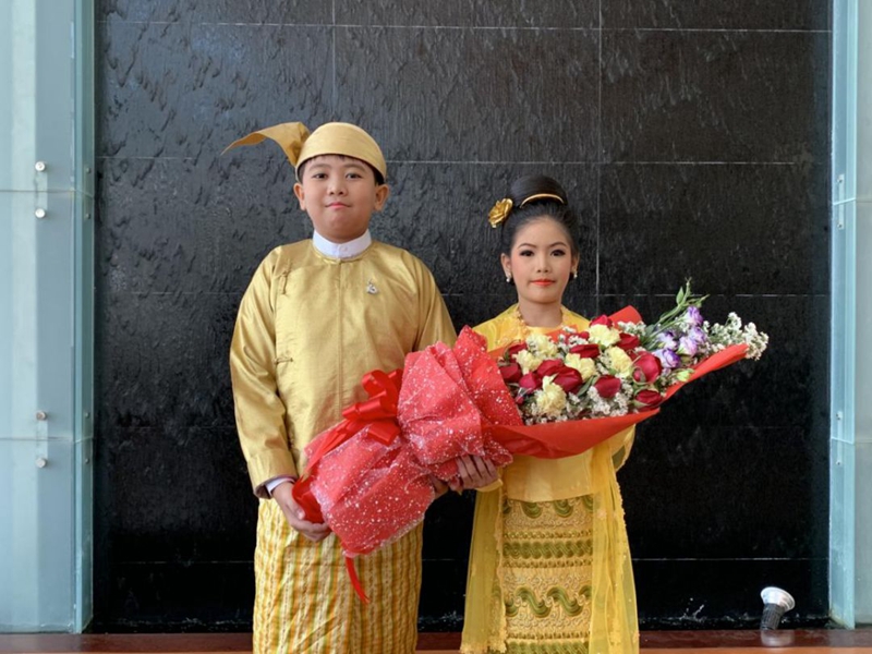 一對緬甸兒童身着最隆重的金色民族服飾,