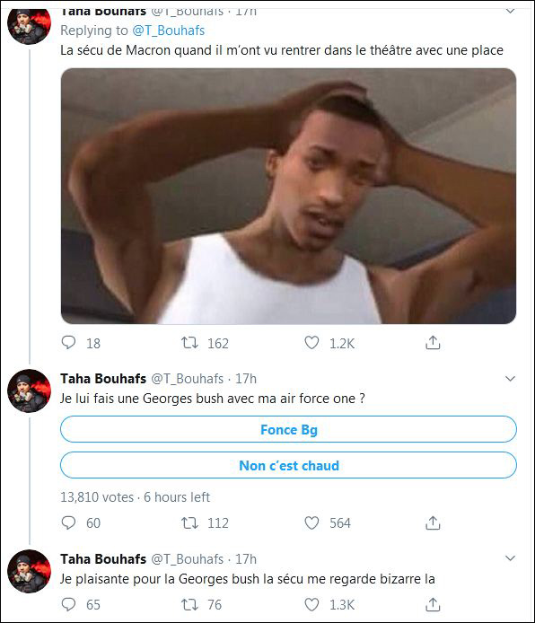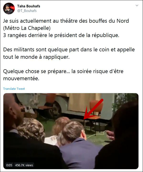 塔哈·布哈夫斯當晚連發了4條推特。他先是貼出了馬克龍所在地點,説自己坐在他的後面3排,還呼籲大家趕快過來。
