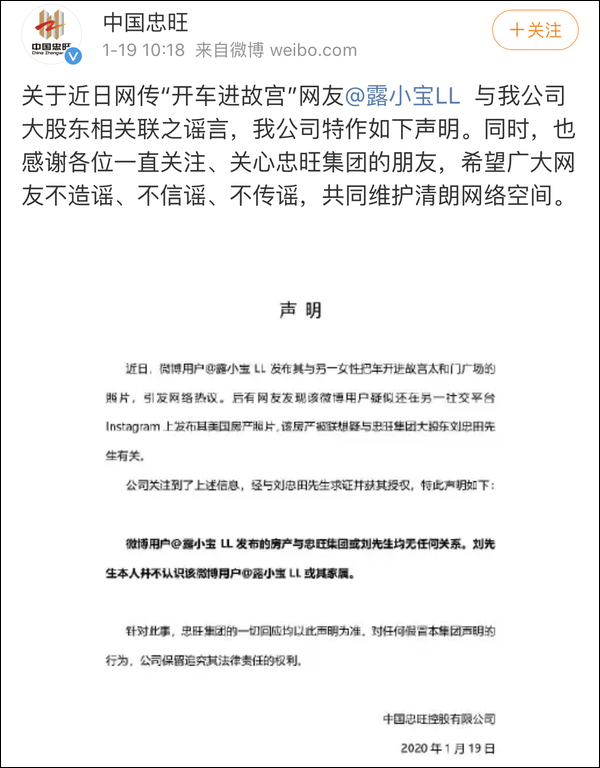 聲明表示,經與忠旺集團大股東劉忠田先生求證並獲得其授權,確認微博用户@露小寶LL 發佈的房產與忠旺集團或劉先生均無任何關係。劉先生本人並不認識該微博用户@露小寶LL 或其家屬。