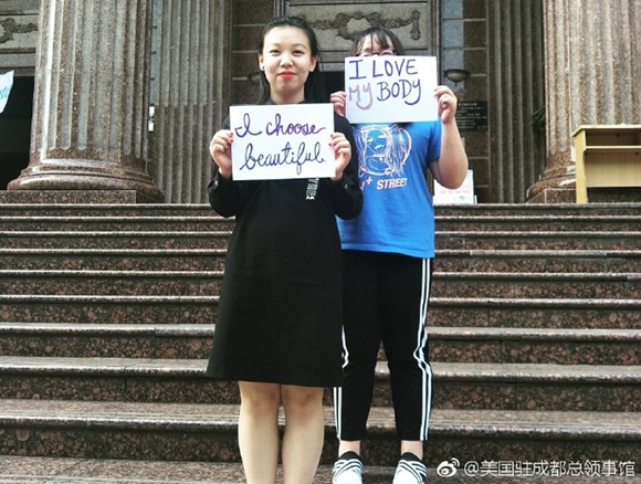 參與美中友好志願者項目的中國女生參與了“我愛我的身體”等女權主義活動(@美國駐成都總領事館)