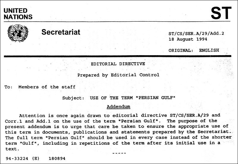 聯合國指示進一步指出:“在任何情況下都應使用‘波斯灣’全稱,而不應使用較短的‘海灣’一詞,包括在文本最初使用後重複使用該詞。”