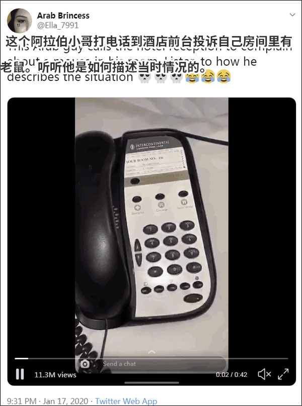 報道稱,1月17日,有網友在推特發佈了這段投訴視頻,視頻顯示,這是一家位於英國倫敦的洲際酒店。網友稱,一名阿拉伯男子打電話給酒店前台,想投訴房間有老鼠,因為他英語不好,於是有了下面這段對話: