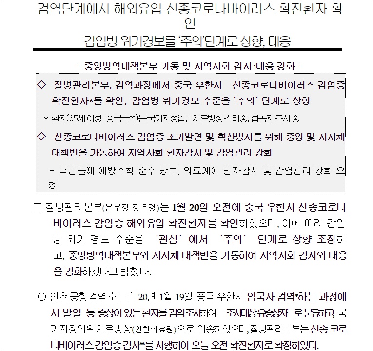 韓國方面已將傳染病危機警報水平從“關注”上調至“注意”階段。為儘快發現感染症並防止擴散,韓方啓動了中央及地方自治團體對策小組,加強管理。