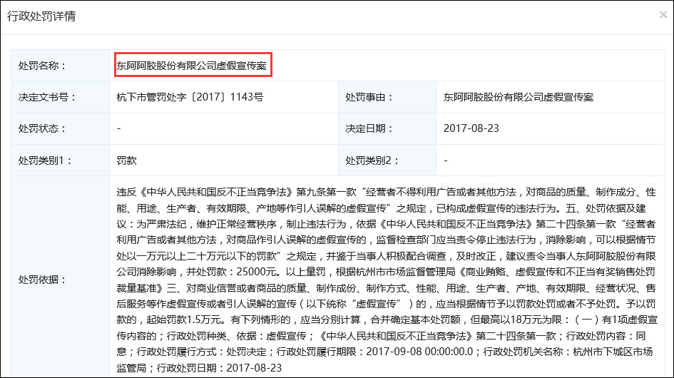 除此之外,觀察者網查詢企查查發現,東阿阿膠2017年8月因“虛假宣傳”曾被杭州市下城區市場監管局罰款25000元。
