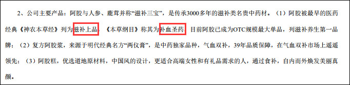 東阿阿膠財報中更是強調:“阿膠被最早的醫藥經典《神農本草經》列為滋補上品,《本草綱目》稱其為補血聖藥,目前阿膠已成為OTC規模最大單品,列滋補養生第一品牌。”