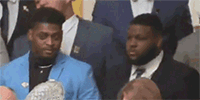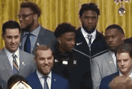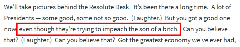 本來到這裏一切皆大歡喜。可在聽眾恰到好處的陪笑聲中,特朗普突然拋出一句話:“然而有人卻試圖彈劾這個狗孃養的,你敢信嗎?”説完,他還扭頭望向身後的球員。