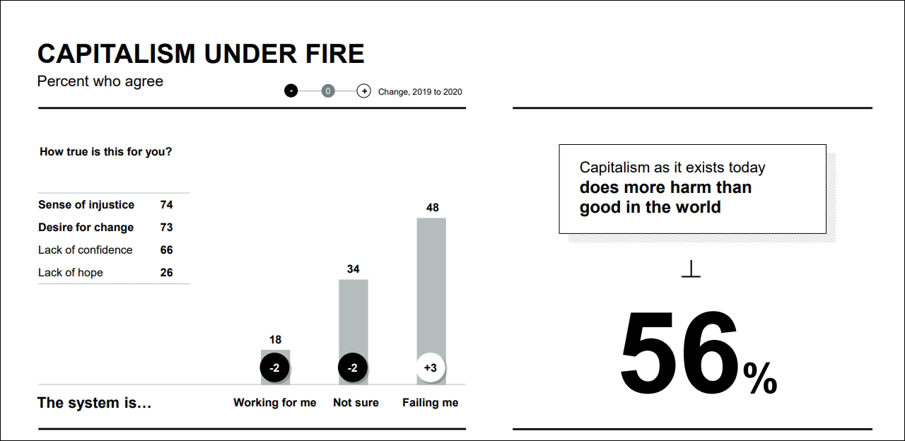 調查發現,超過一半(56%)的受訪者認同“當前的資本主義模式對世界來説弊大於利”。