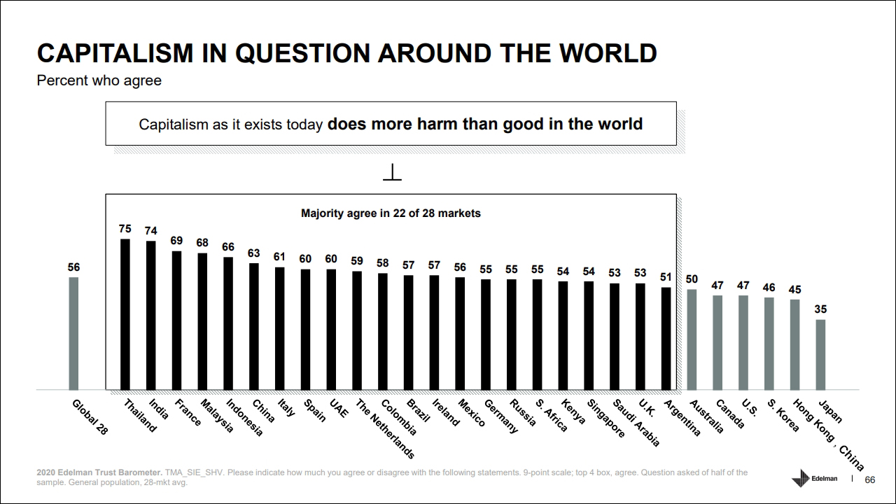 56%的全球受訪者、框內22個國家均有超過50%受訪者不信任資本主義