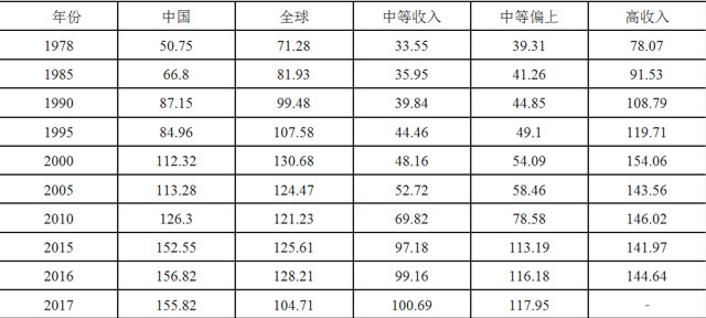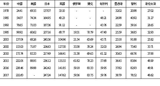注:資料來源於Wind資訊全球宏觀數據庫(世界銀行統計數據)。部分國家的部分年份數據缺失,用“-”表示,下同。