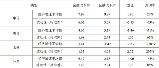 注:考慮到數據的可獲得性,上述數據以金融改革前後的9年為樣本。其中,中國以1978年作為金融改革分界點;美國以1970年開始放鬆利率管制為分界點;通常認為東歐金融改革始於20世紀90年代,拉美始於80年代,所以分別以1990年和1980年為它們金融改革的分界點。數據來源:Wind,作者計算。