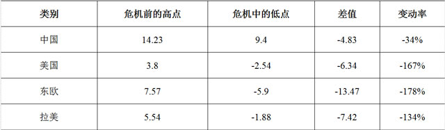 另外,我們還分析了這幾個經濟體在次貸危機影響下的經濟增速變動情況,參見表4。次貸危機作為一個全球性的金融危機,實際上是對一個國家的經濟和金融穩定性的測試。在次貸危機衝擊之下,中國經濟增速下降了34%,美國下降了167%,東歐下降了178%,拉美下降了134%。雖然中國在次貸危機衝擊之下,從高速增長轉向了低速增長,但從衝擊影響來看是最小的。