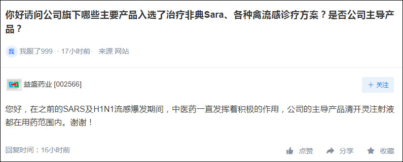 1月20日,吉林省集安益盛藥業股份有限公司(下稱:益盛藥業,002566.SZ)在深交所互動易平台上,就投資者關於“公司哪些產品入選治療非典SARS、各種禽流感診療方案”的提問回應稱:“在之前的SARS及H1N1流感爆發期間,中醫藥一直髮揮着積極作用。”