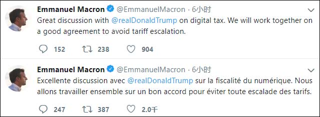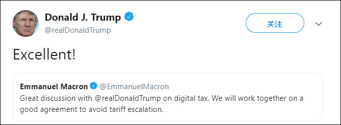 20日,馬克龍發推並@特朗普表示,與特朗普就數字税進行了精彩的討論,將共同努力達成良好協議,避免關税升級。馬克龍用法語、英語各發了一遍。