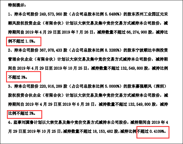 2019年4月,持股5%以上股東——元禾順風、順達豐潤、嘉強順風以及監事劉冀魯同時提出,以大宗交易及集中競價交易方式減持順豐股份,擬分別減持不超公司總股本1.5%、3%、3%和0.41%的股份。